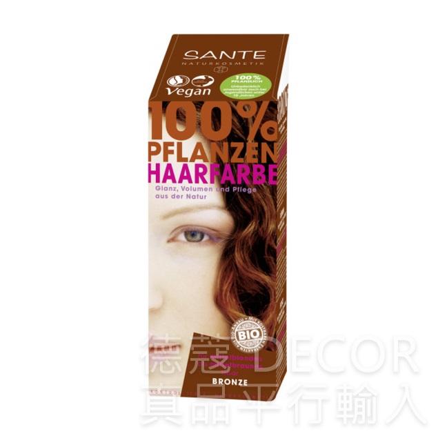 Sante 的植物染髮劑不像一般含化學成份染髮劑會深入頭髮,Sante 植物染髮劑就像一層保護膜裹在每一根頭髮上,不只保護髮質讓它擁有原有的健康,且顏色自然,光亮,有彈性,增加法量感。Sante 植物染髮劑使用全天然成份,如鬱金香,咖啡,木槿, …. 等。Sante 總共推出 8 種不同的顏色供消費者使用,且所染出的顏色是不能夠洗淨的。每一樣品都經由皮膚科醫生檢查合格,消費者可放心的使用。
