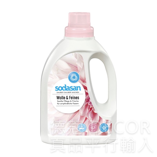 動物毛的纖維如羊毛、蠶絲和毛紗類衣物對於鹼性的洗潔劑相當敏感,因為鹼液會讓浸泡膨漲的纖維在洗衣機中糾成一團。 為了避免這樣的情形發生,SODASAN洗衣精(適用羊毛&細緻衣服)的pH-值調到最理想低於7,此外它還會在洗衣機中形成一種特別堅固的泡沫,它能明顯減緩衣服與水的撞擊力,特別保護敏感衣物纖維。
