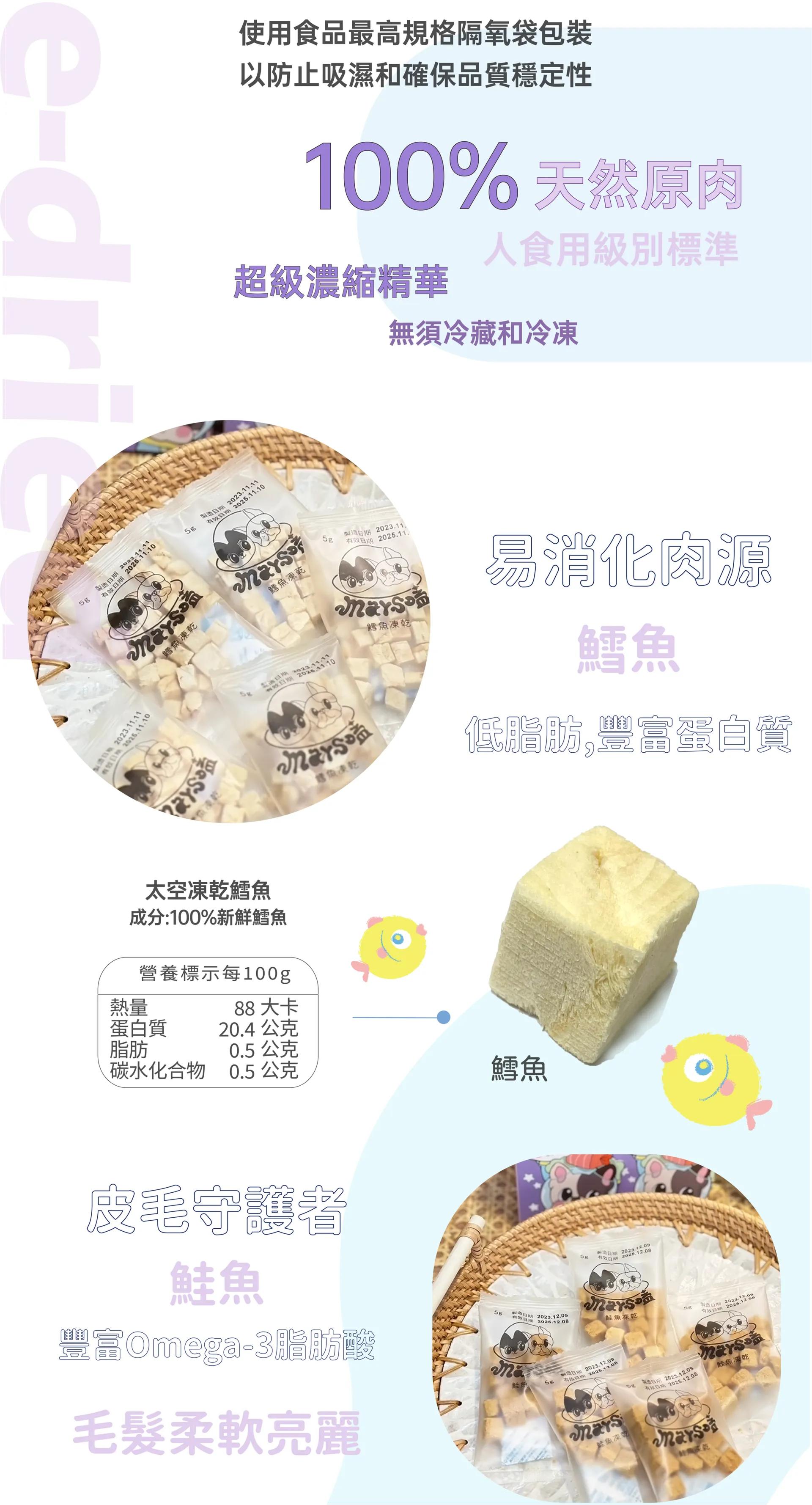 ■ 真空冷凍乾燥技術,保留食材原汁原味,確保口感和營養兼具。 ■一口一個剛剛好的完美尺寸 ■ 無防腐劑,無香料 ■ 多功能零食:適合獎勵訓練、誘食,或扮在飼料上進行營養補充。 ■高規格食品隔氧袋,隨手包,新鮮即食 【規格】 ■ 重量:1入5g,1盒5入 ■ 產地:台灣 ■ 適用對象:全齡 狗/貓