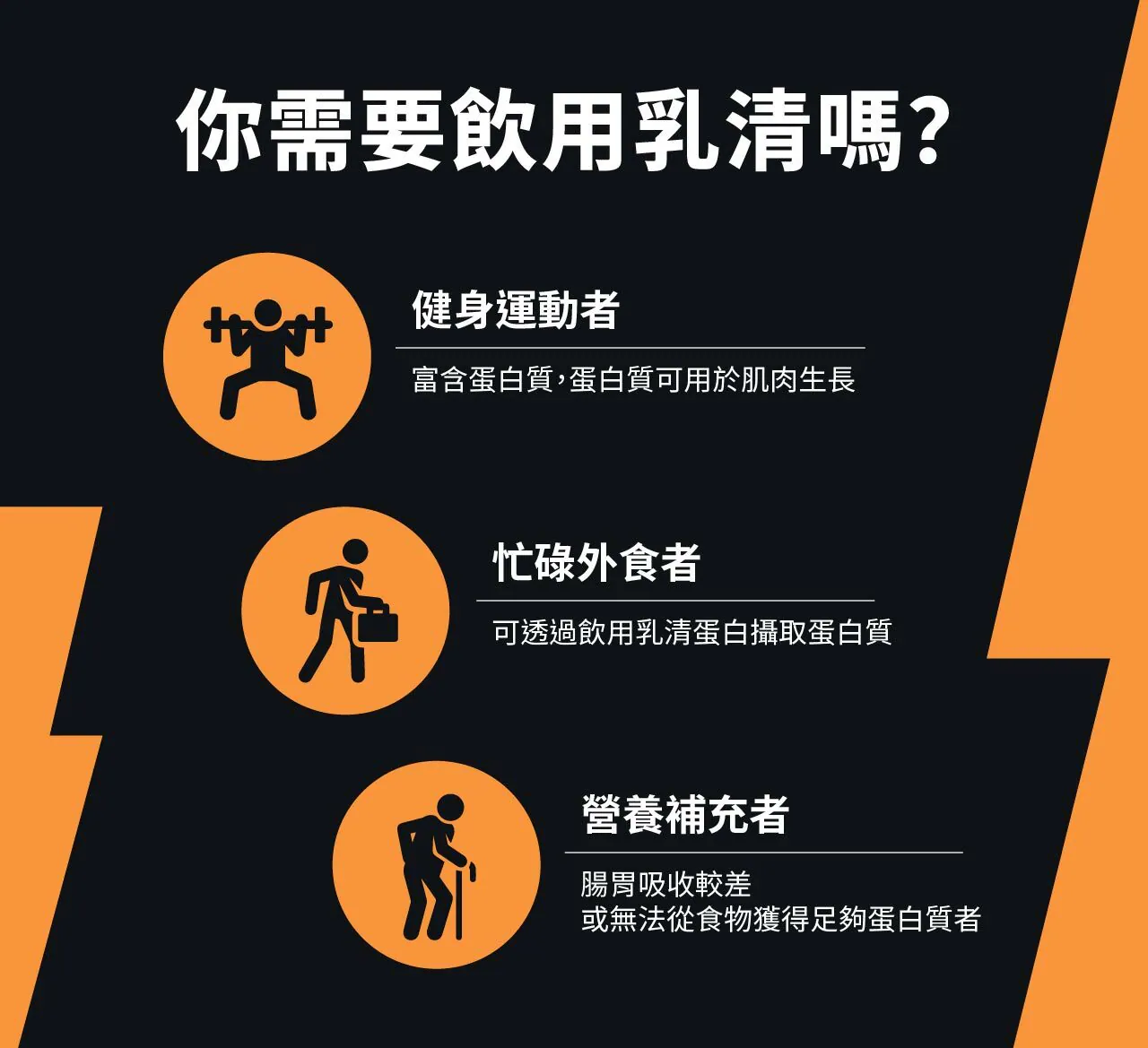 - 忙碌外食者:可透過飲用乳清蛋白攝取蛋白質